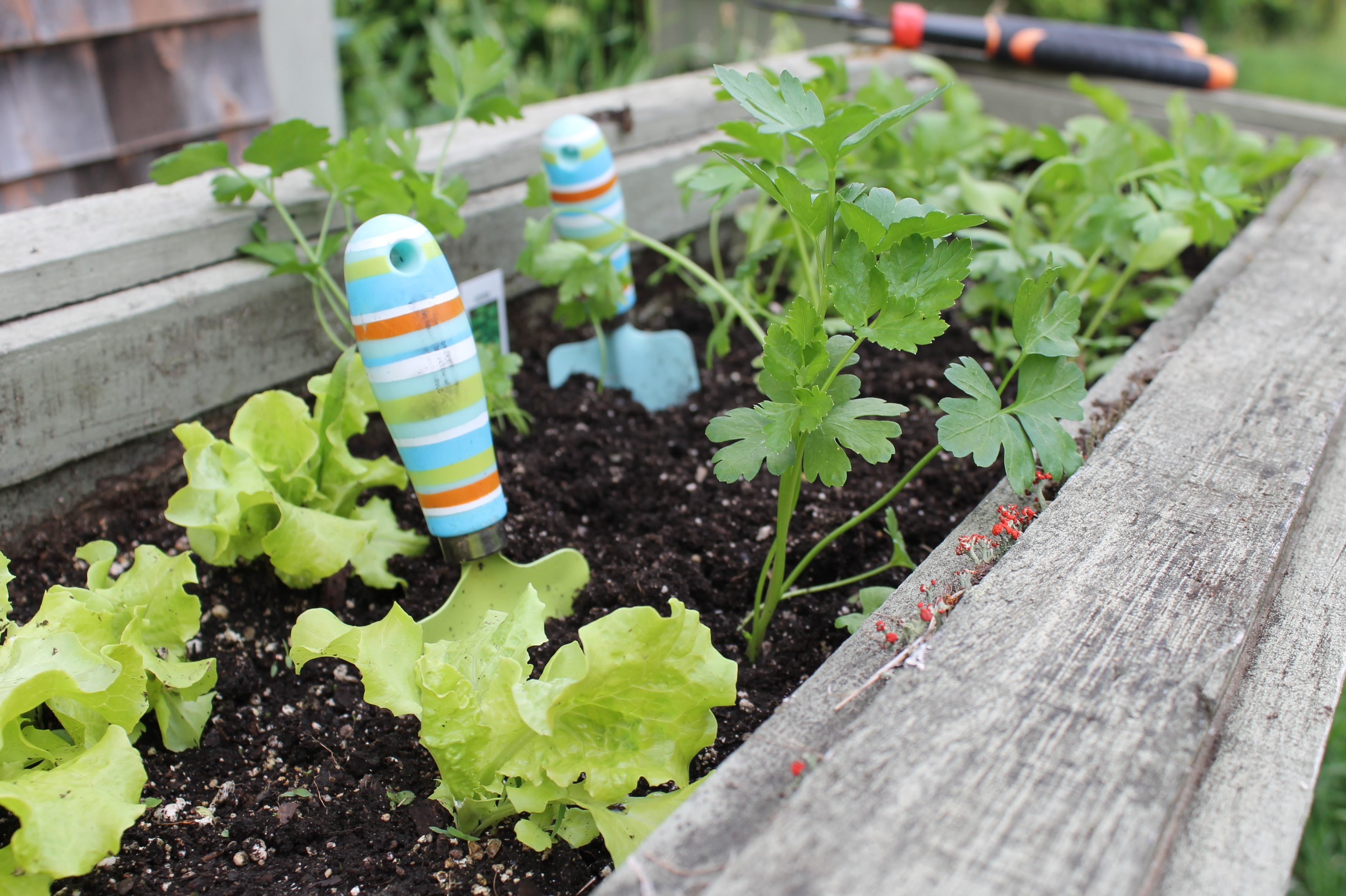 – Our first small harvest! I didn’t use markers when I planted the greens in this box, and it seems that my memory failed me. I thought I put the rocket arugula in the center, and that it hadn’t sprouted, but was pleasantly surprised to see and taste that we do indeed have a small crop. I love arugula. The peppery bite is wonderful in salads, and I’ve got a recipe for chicken salad with arugula that I’m looking forward to trying.