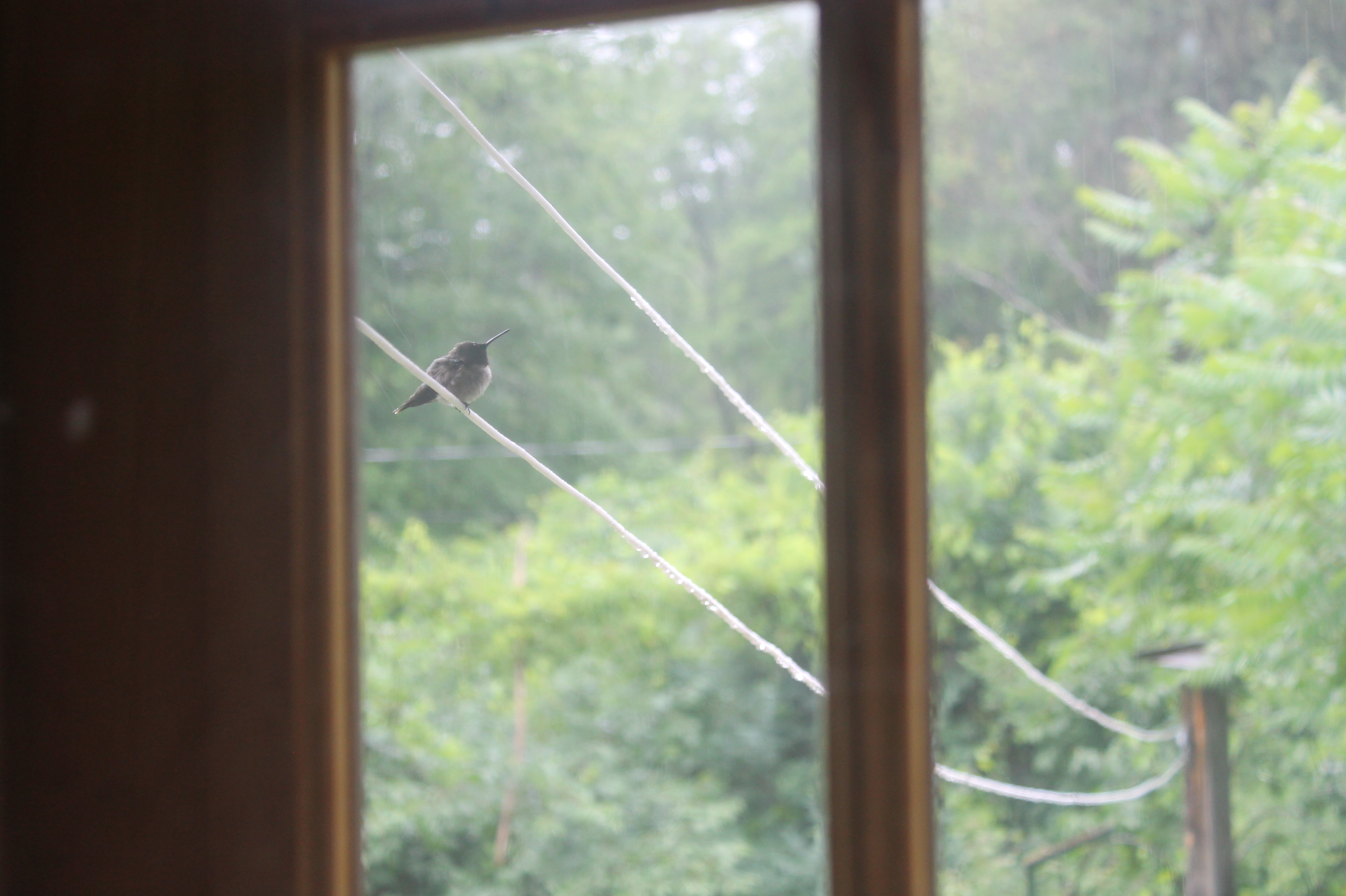 – We had a storm cloud make itself comfortable right over our town today, and it rained steadily without ceasing. This little guy took shelter under the overhang right outside our backdoor. I can’t ever remember seeing a hummingbird before living here, and they have visited us close to a dozen times in the last month. I’d like to get the feeder sterilized and filled so that I can see more of them. If anyone has tips or recipes to share, I’d love the guidance!