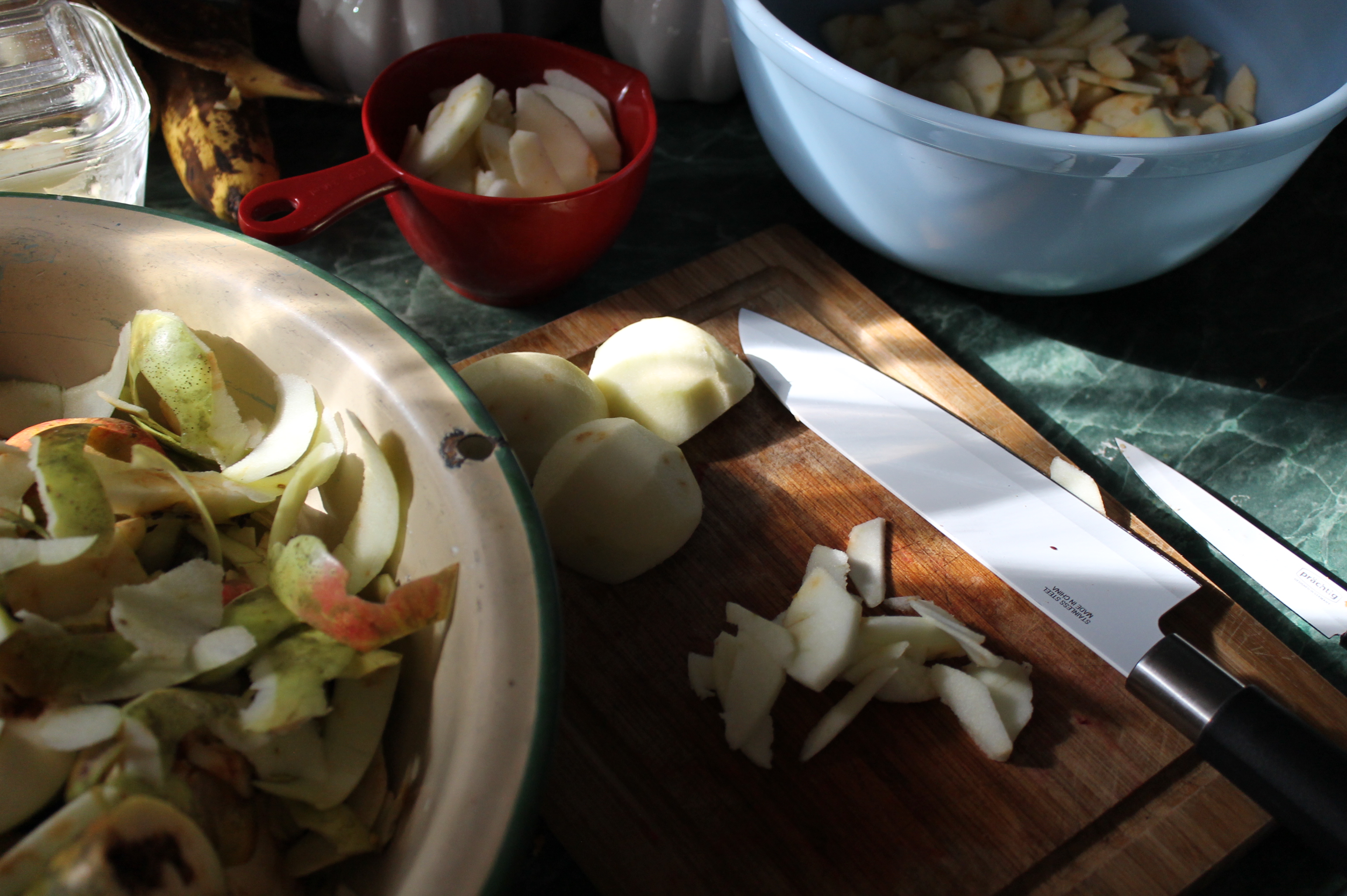 3. Today, I finally dealt with the bag of apples we picked in the other yard, how many weeks ago? Some were no good. Others were perfect down to the middle where the core was rotten. I sliced and peeled and salvaged enough to make one pie filling, which is now in the freezer, and a batch of crockpot applesauce, which is currently simmering on the counter. I followed the basic Better Homes & Gardens recipe for the pie filling, minus the nutmeg. It works really well to freeze it, and then thaw just before baking in a single crust pie. We usually do a crumb top – it’s easier, and J actually prefers it. I’ve never tried making applesauce this way, so I’m curious to see how it turns out.